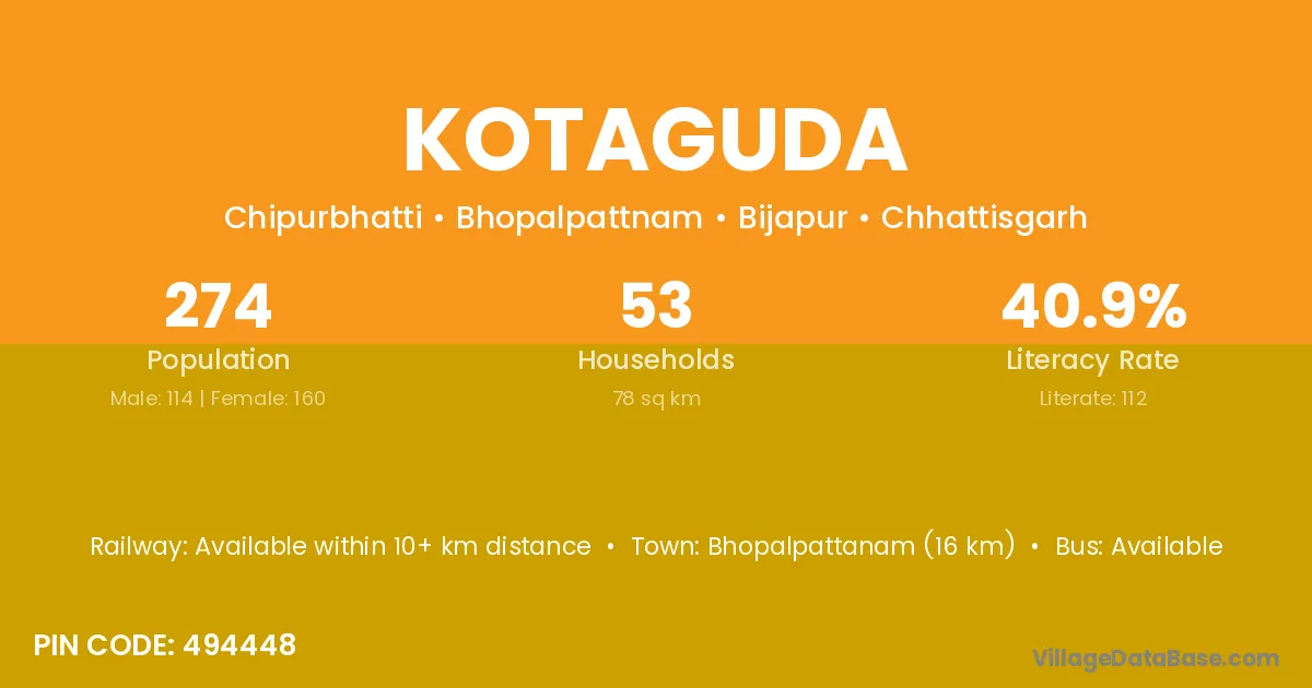 Bhopalpattanam (16 km) is the nearest town to Kotaguda village for major economic activities and is located approximately 16 km away.