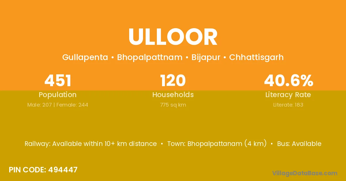 Bhopalpattanam (4 km) is the nearest town to Ulloor village for major economic activities and is located approximately 4 km away.