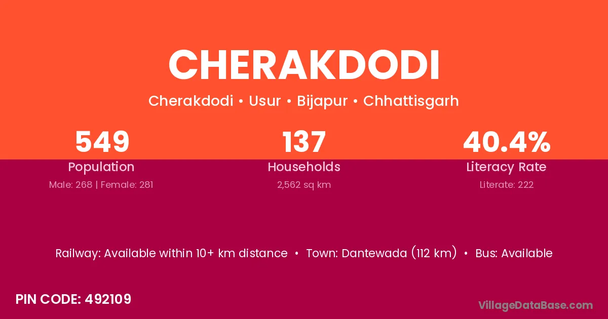 Dantewada (112 km) is the nearest town to Cherakdodi village for major economic activities and is located approximately 112 km away.