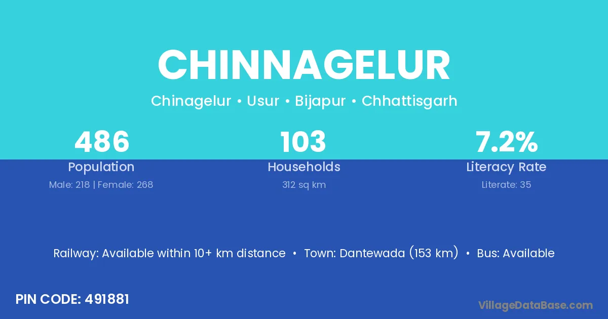 Dantewada (153 km) is the nearest town to Chinnagelur village for major economic activities and is located approximately 153 km away.