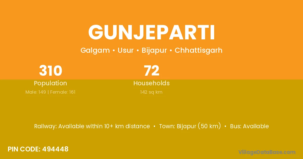 Bijapur (50 km) is the nearest town to Gunjeparti village for major economic activities and is located approximately 50 km away.