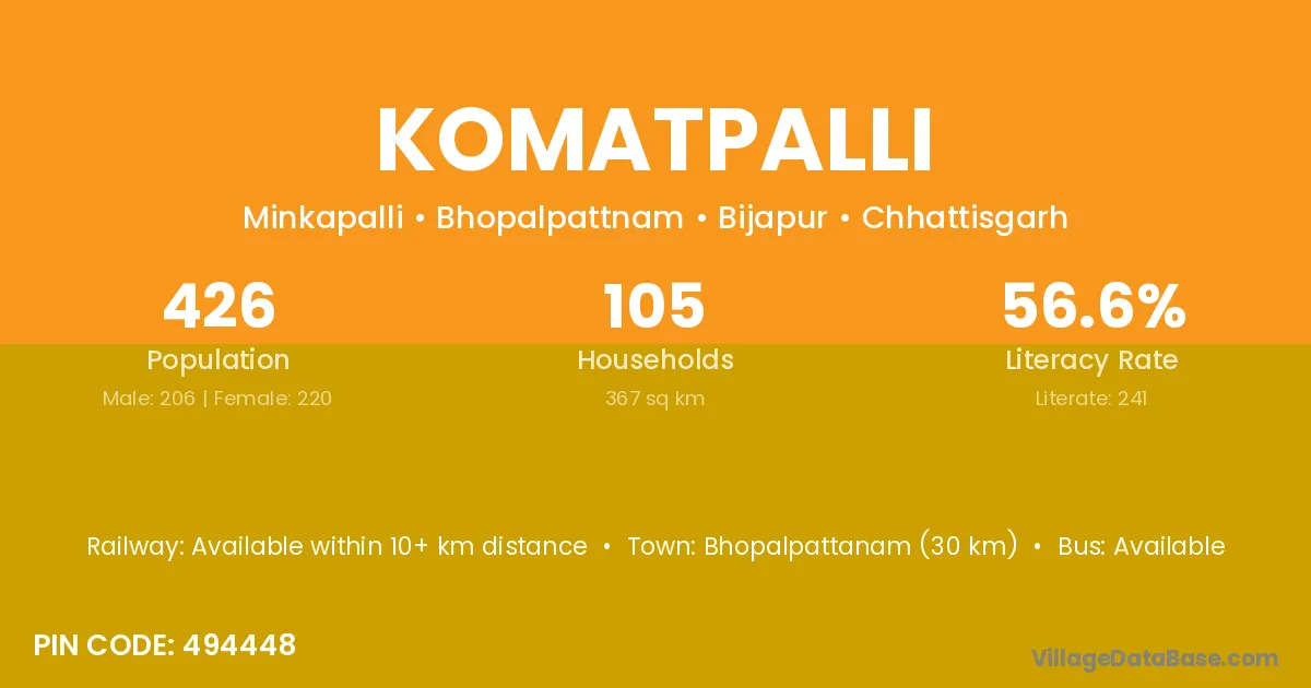 Jagdalpur (239 km) is the nearest town to Komatpalli village for major economic activities and is located approximately 239 km away.