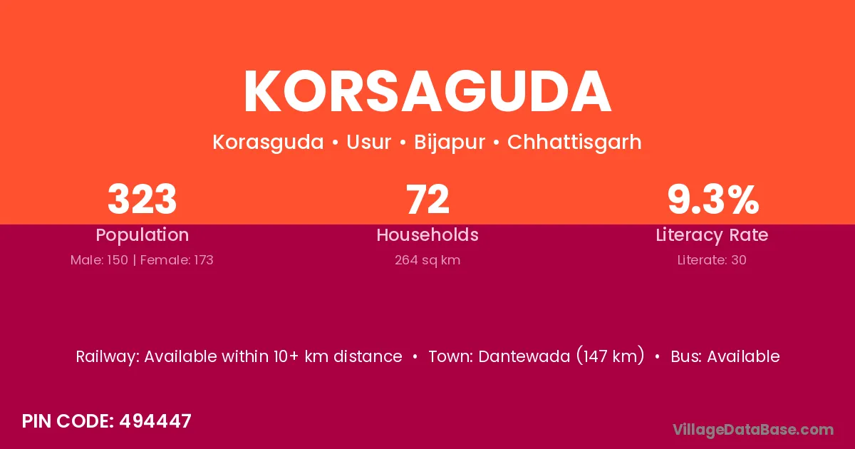 Dantewada (147 km) is the nearest town to Korsaguda village for major economic activities and is located approximately 147 km away.