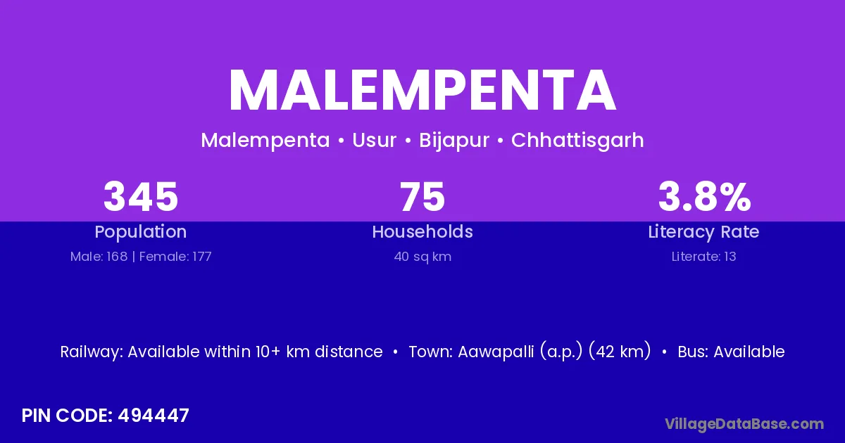 Aawapalli (a.p.) (42 km) is the nearest town to Malempenta village for major economic activities and is located approximately 42 km away.