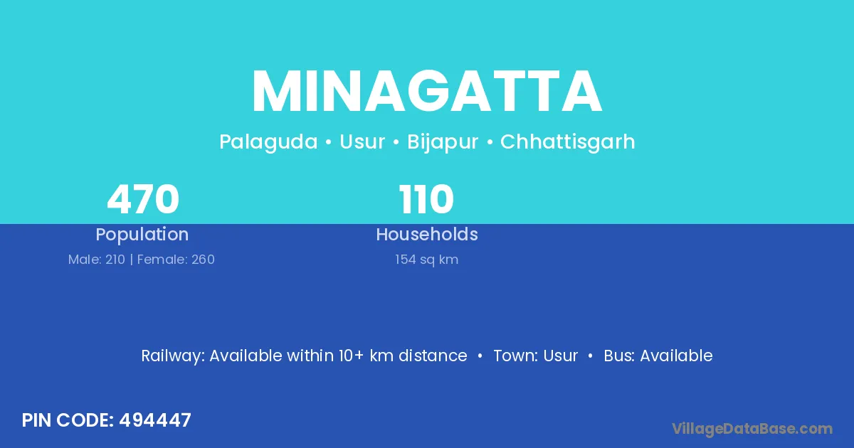 Minagatta village has a total population of 470 people, of which 210 are males and 260 are females.