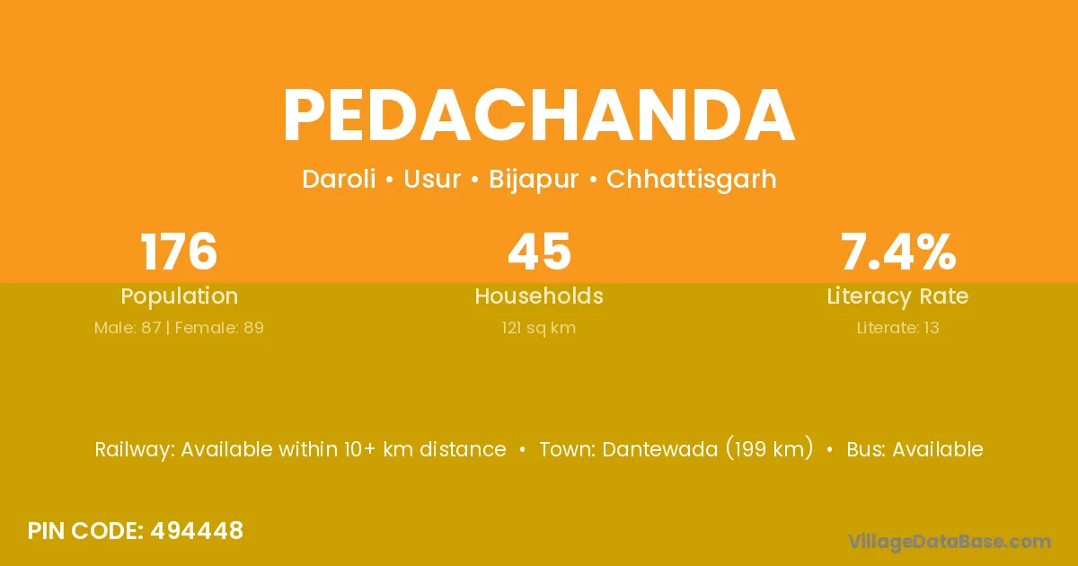 Dantewada (199 km) is the nearest town to Pedachanda village for major economic activities and is located approximately 199 km away.