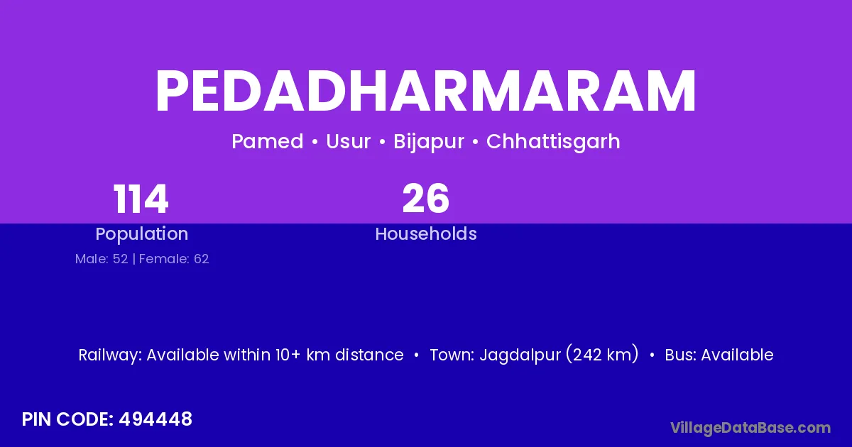 Pedadharmaram village has a total population of 114 people, of which 52 are males and 62 are females.