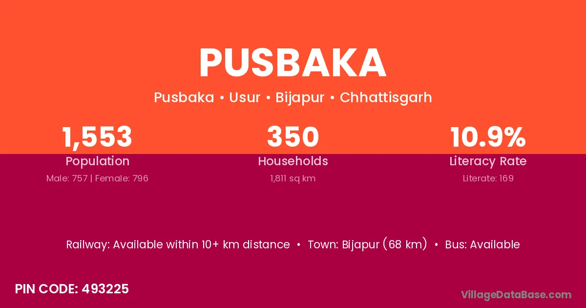 Bijapur (68 km) is the nearest town to Pusbaka village for major economic activities and is located approximately 68 km away.