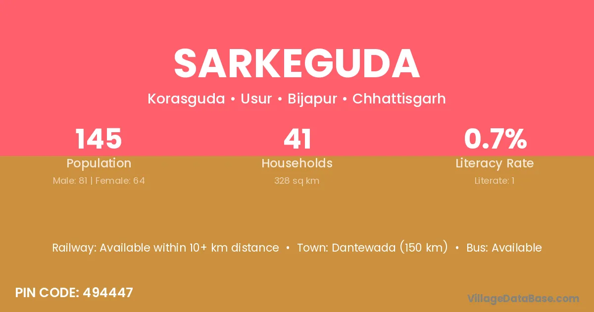 Dantewada (150 km) is the nearest town to Sarkeguda village for major economic activities and is located approximately 150 km away.