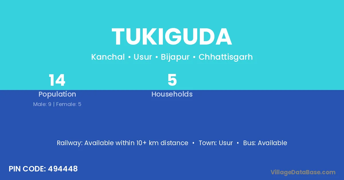 Tukiguda village has a total population of 14 people, of which 9 are males and 5 are females.