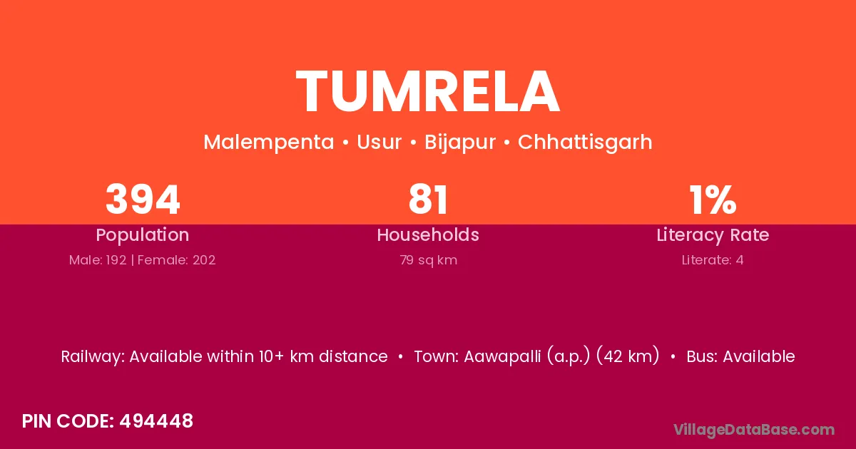 Aawapalli (a.p.) (42 km) is the nearest town to Tumrela village for major economic activities and is located approximately 42 km away.
