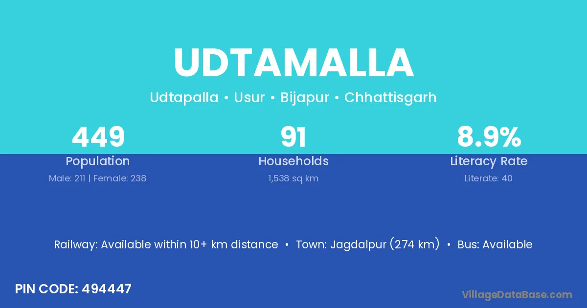 Jagdalpur (274 km) is the nearest town to Udtamalla village for major economic activities and is located approximately 274 km away.