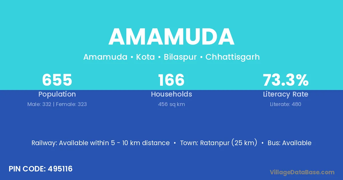 Ratanpur (25 km) is the nearest town to Amamuda village for major economic activities and is located approximately 25 km away.