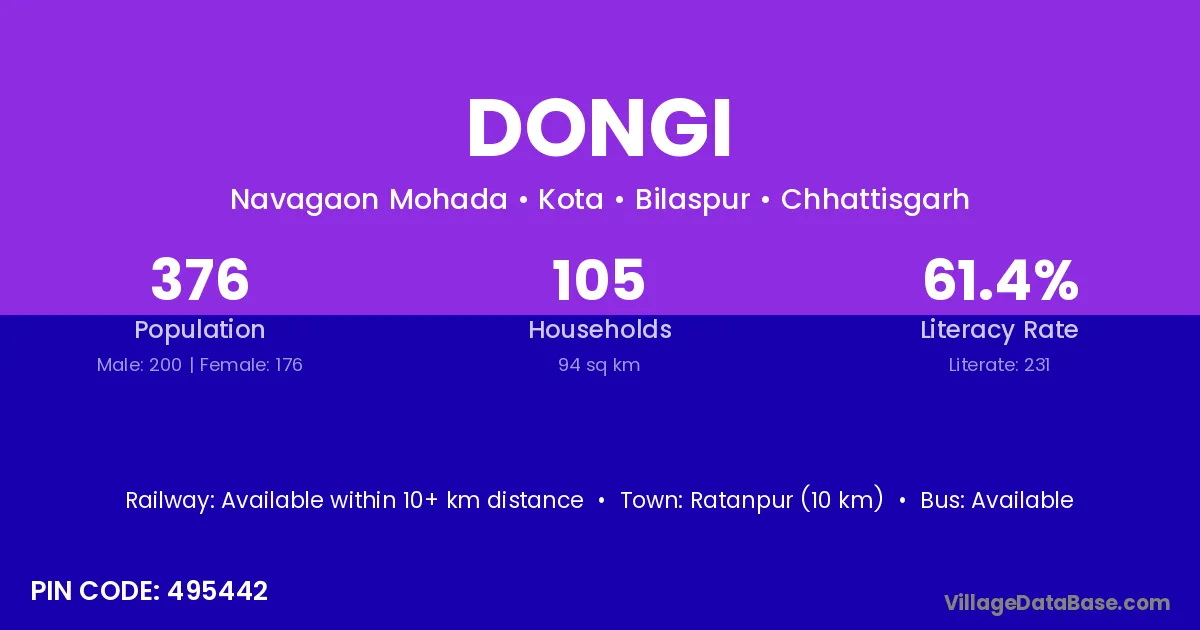 Ratanpur (10 km) is the nearest town to Dongi village for major economic activities and is located approximately 10 km away.