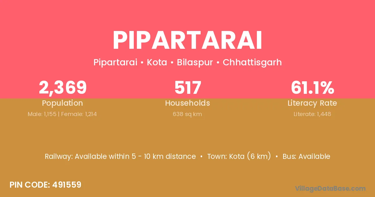 Pipartarai village is located in the Kota Tehsil of the Bilaspur district in Chhattisgarh .