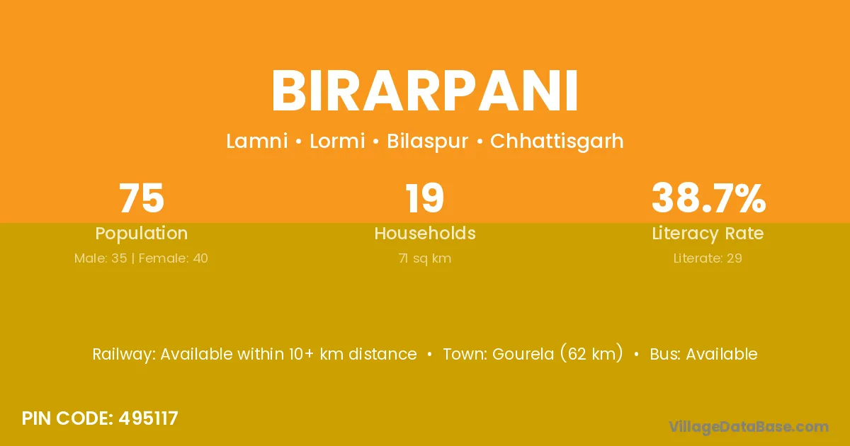 Gourela (62 km) is the nearest town to Birarpani village for major economic activities and is located approximately 62 km away.