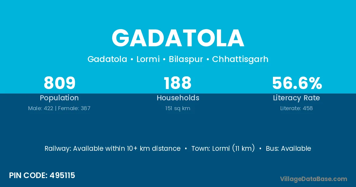 Lormi (11 km) is the nearest town to Gadatola village for major economic activities and is located approximately 11 km away.