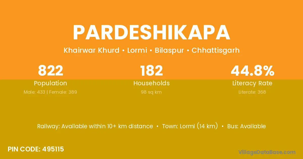 Lormi (14 km) is the nearest town to Pardeshikapa village for major economic activities and is located approximately 14 km away.