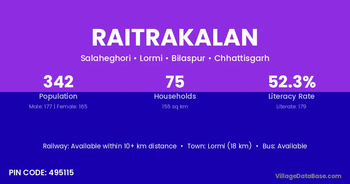 Lormi (18 km) is the nearest town to Raitrakalan village for major economic activities and is located approximately 18 km away.