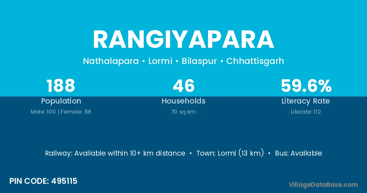 Lormi (13 km) is the nearest town to Rangiyapara village for major economic activities and is located approximately 13 km away.