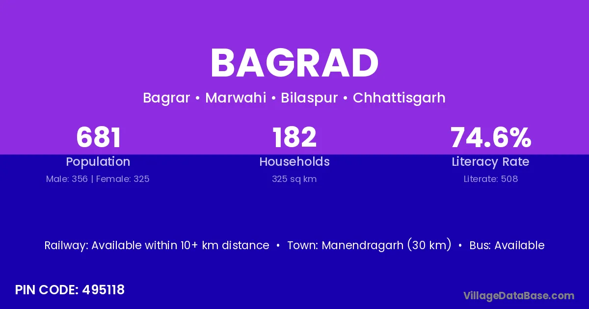 Manendragarh (30 km) is the nearest town to Bagrad village for major economic activities and is located approximately 30 km away.