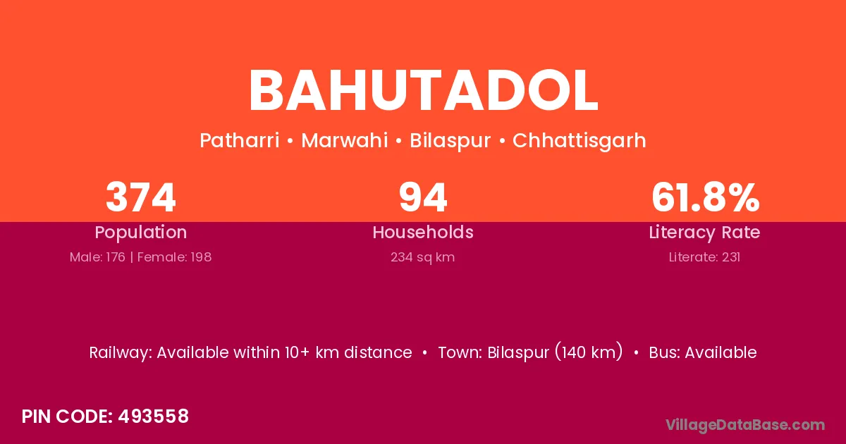 Bahutadol village has a total population of 374 people, of which 176 are males and 198 are females.
