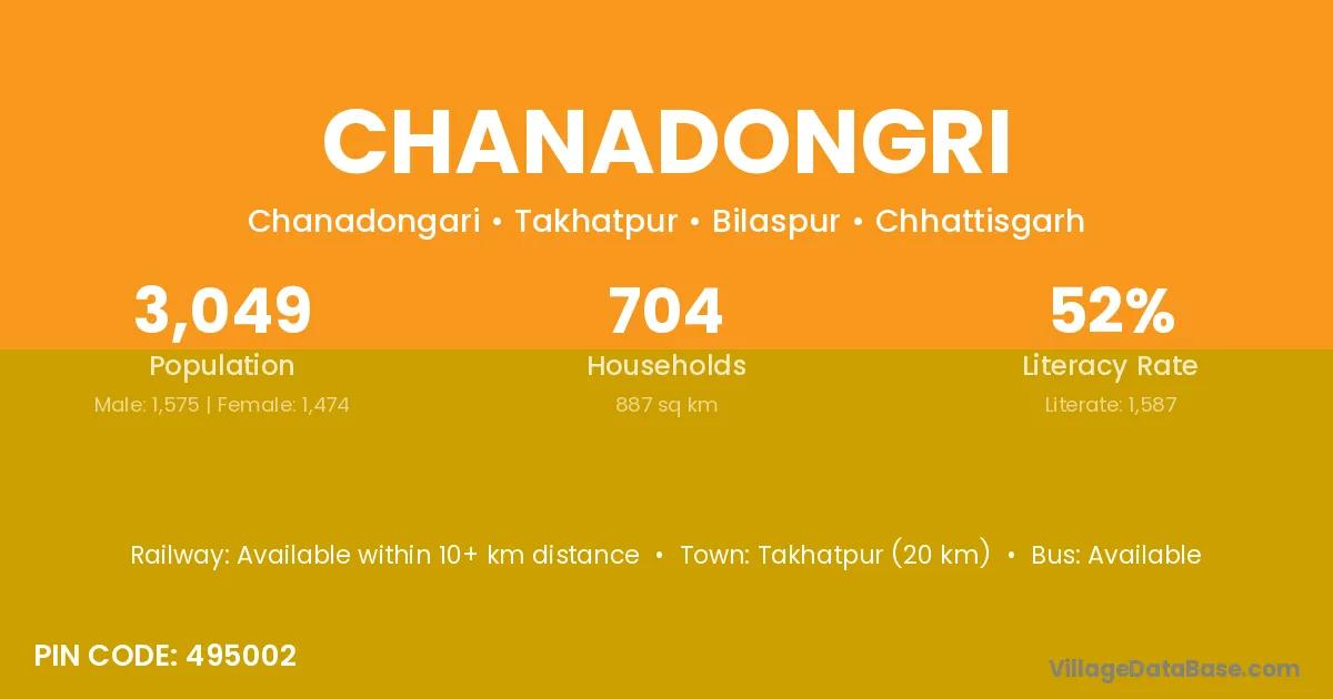 Pendra (45 km) is the nearest town to Chanadongri village for major economic activities and is located approximately 45 km away.