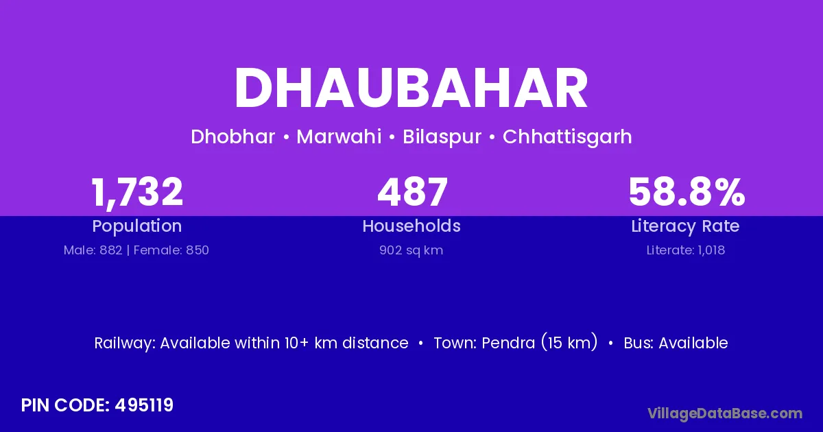 Pendra (15 km) is the nearest town to Dhaubahar village for major economic activities and is located approximately 15 km away.