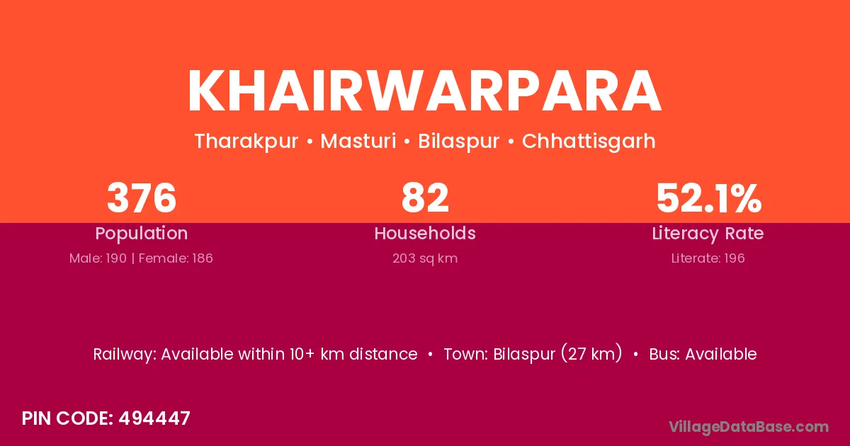 Bilaspur (27 km) is the nearest town to Khairwarpara village for major economic activities and is located approximately 27 km away.