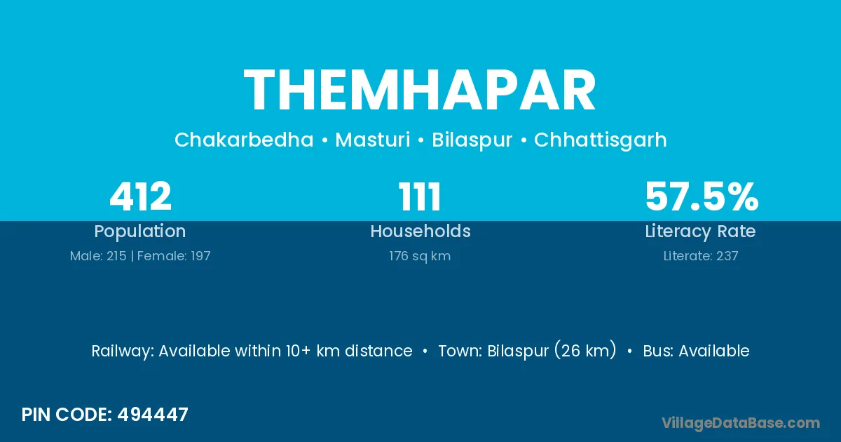 Bilaspur (26 km) is the nearest town to Themhapar village for major economic activities and is located approximately 26 km away.