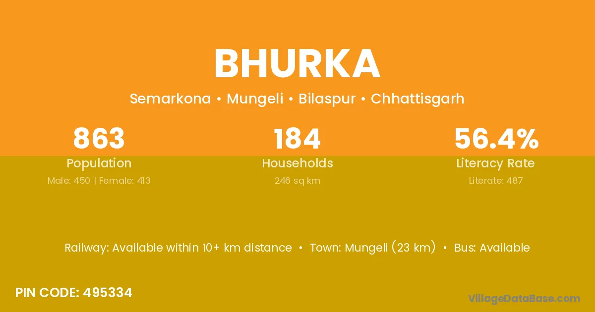 Mungeli (23 km) is the nearest town to Bhurka village for major economic activities and is located approximately 23 km away.