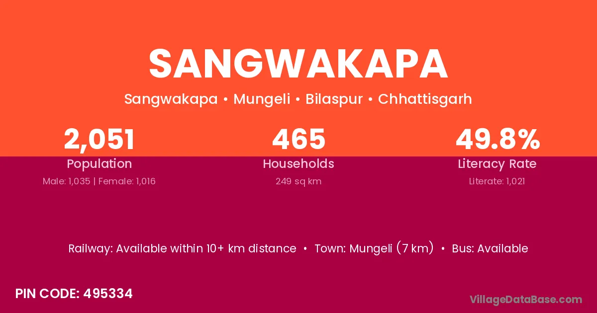 Sangwakapa village has a total population of 2,051 people, of which 1,035 are males and 1,016 are females.