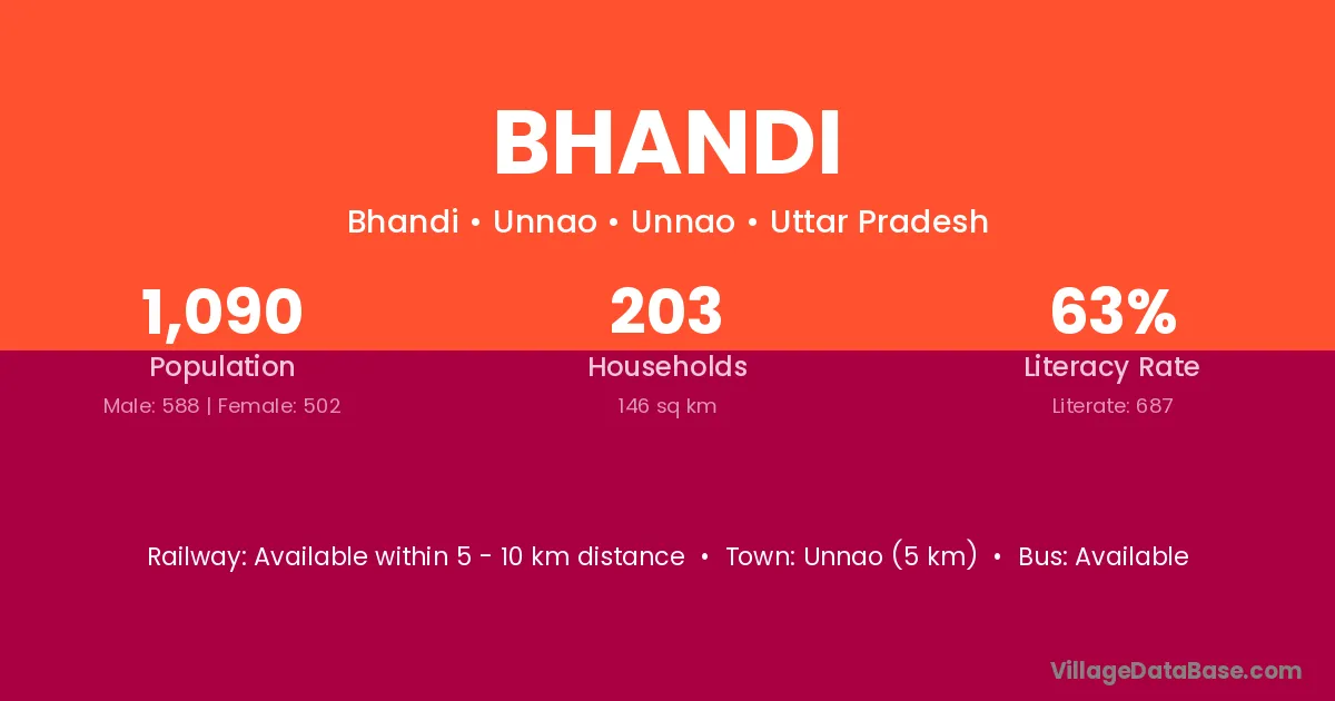 The literacy rate of Bhandi village is 52.24%. Male literacy stands at 61.63% and female literacy at 42.85%.