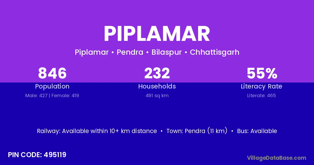 Pendra (11 km) is the nearest town to Piplamar village for major economic activities and is located approximately 11 km away.