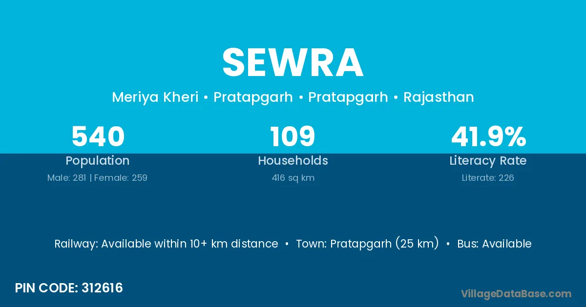 Sewra village has a total population of 999 people, of which 501 are males and 498 are females.