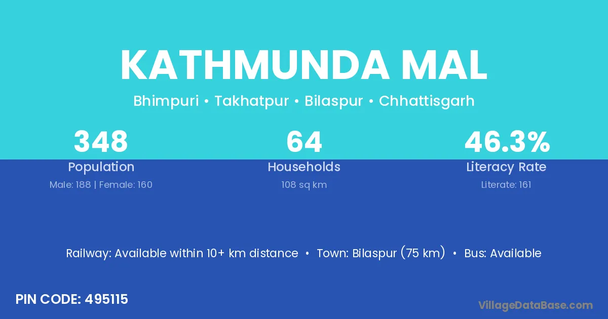 Bilaspur (75 km) is the nearest town to Kathmunda Mal village for major economic activities and is located approximately 75 km away.