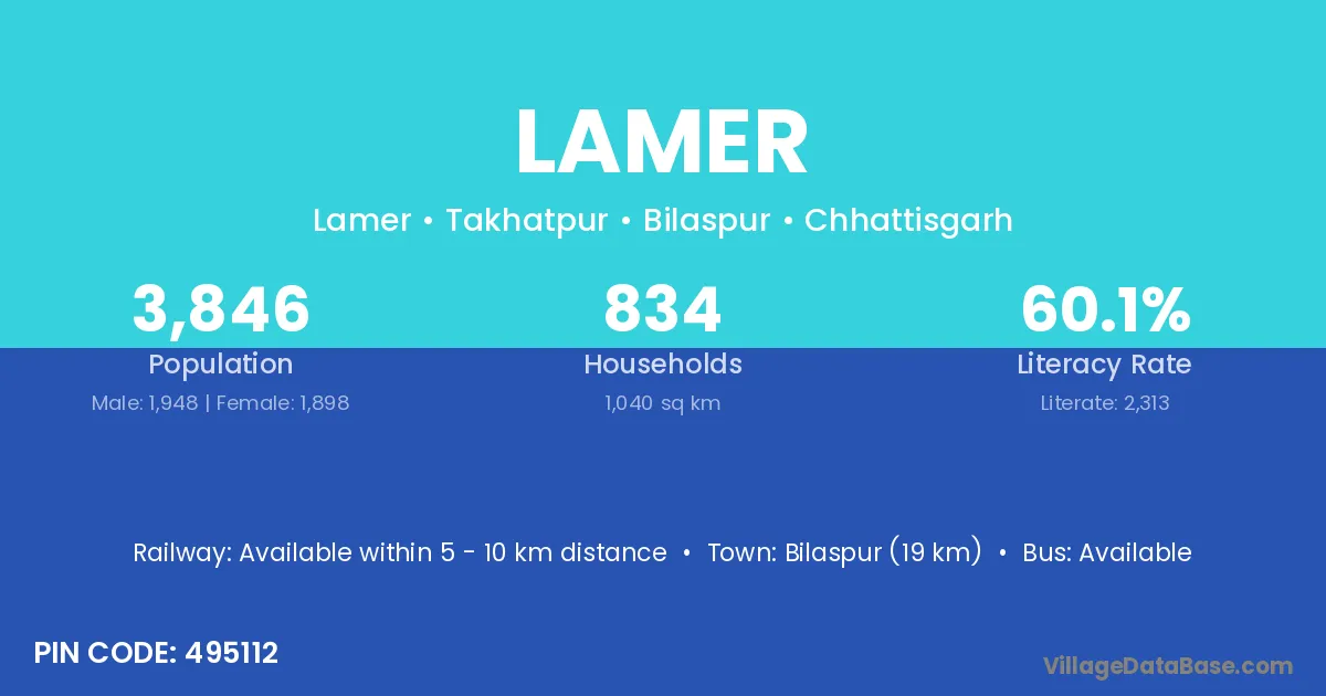 Bilaspur (19 km) is the nearest town to Lamer village for major economic activities and is located approximately 19 km away.