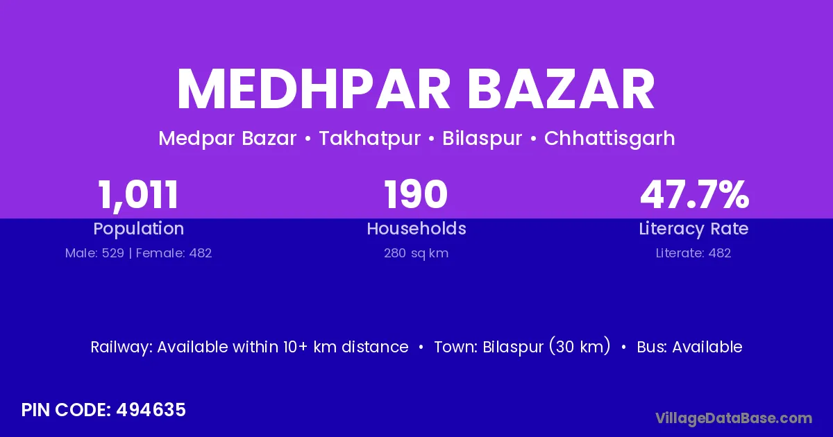 Bilaspur (30 km) is the nearest town to Medhpar Bazar village for major economic activities and is located approximately 30 km away.
