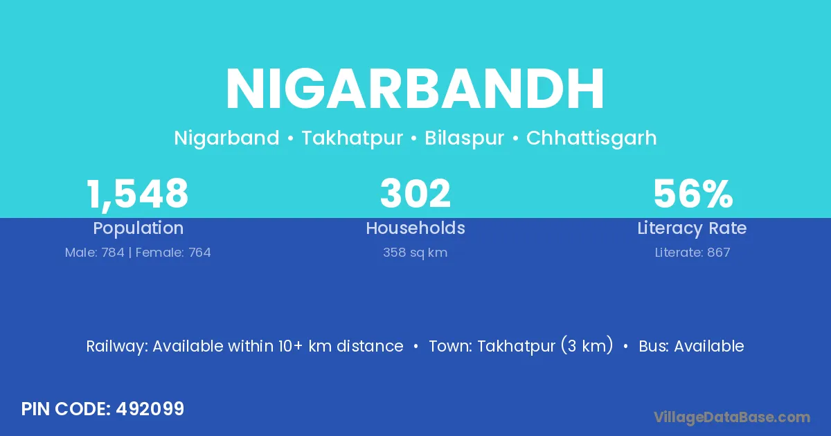 Takhatpur (3 km) is the nearest town to Nigarbandh village for major economic activities and is located approximately 3 km away.
