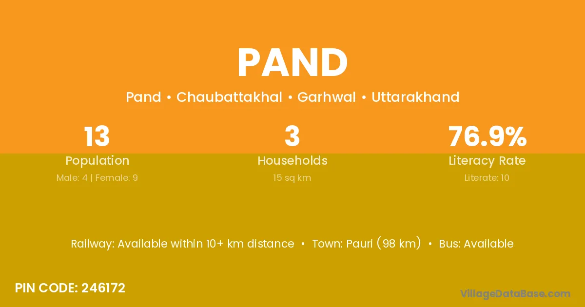 The literacy rate of Pand village is 66.34%. Male literacy stands at 74.84% and female literacy at 58.21%.