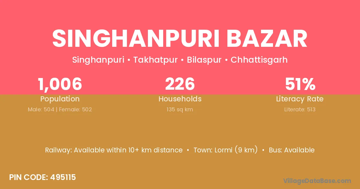 Singhanpuri Bazar village has a total population of 1,006 people, of which 504 are males and 502 are females.