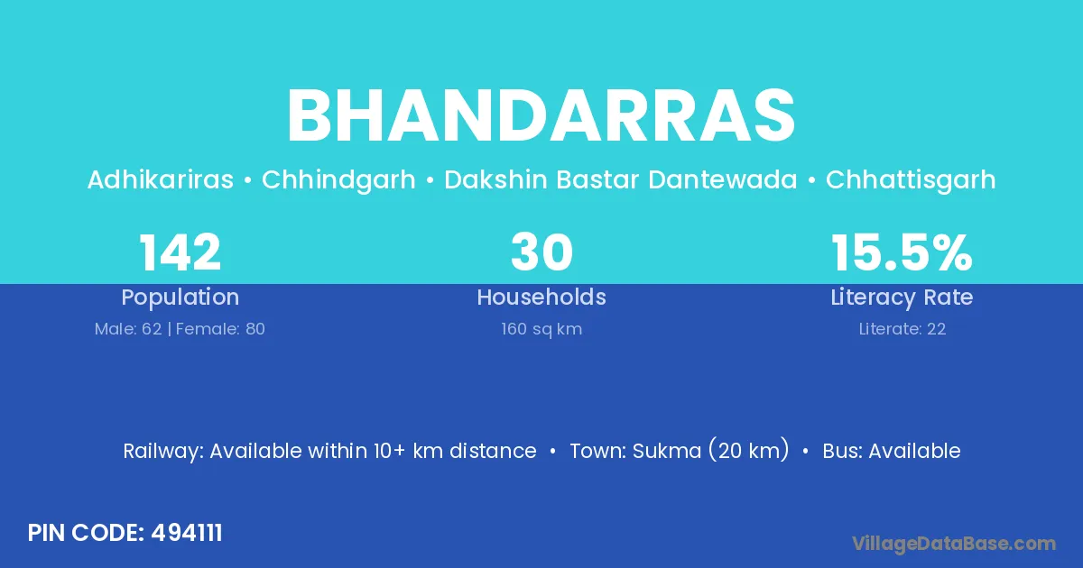Sukma (20 km) is the nearest town to Bhandarras village for major economic activities and is located approximately 20 km away.