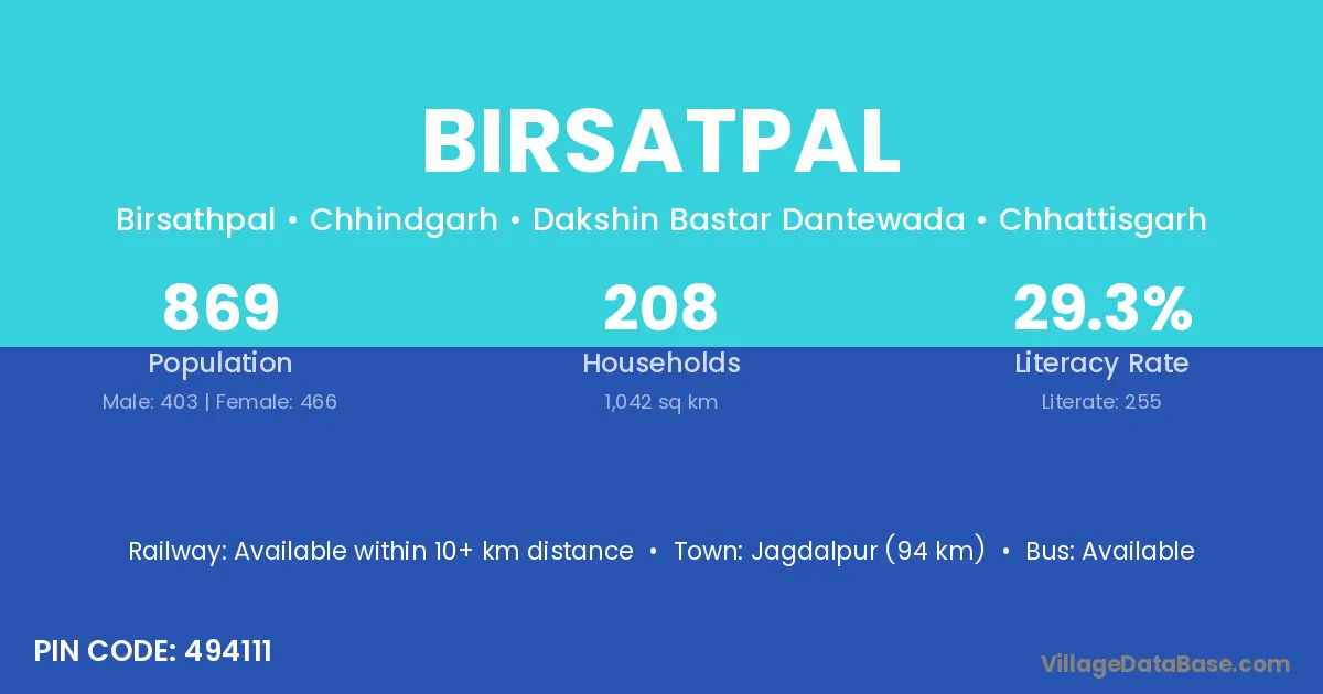 Jagdalpur (94 km) is the nearest town to Birsatpal village for major economic activities and is located approximately 94 km away.