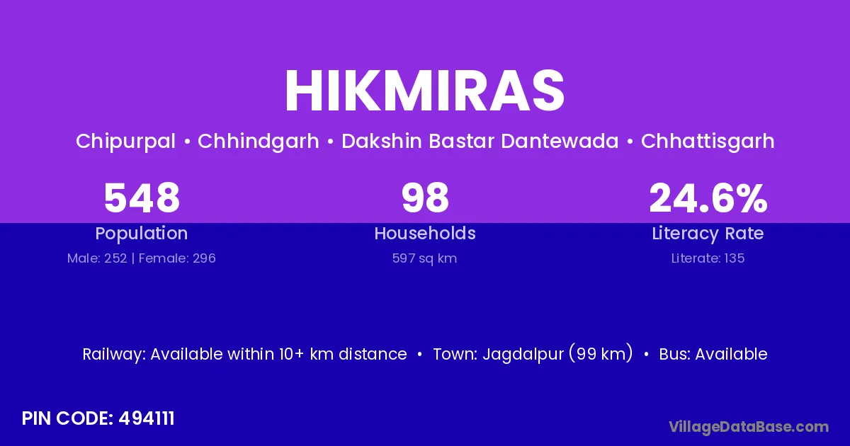 Jagdalpur (99 km) is the nearest town to Hikmiras village for major economic activities and is located approximately 99 km away.