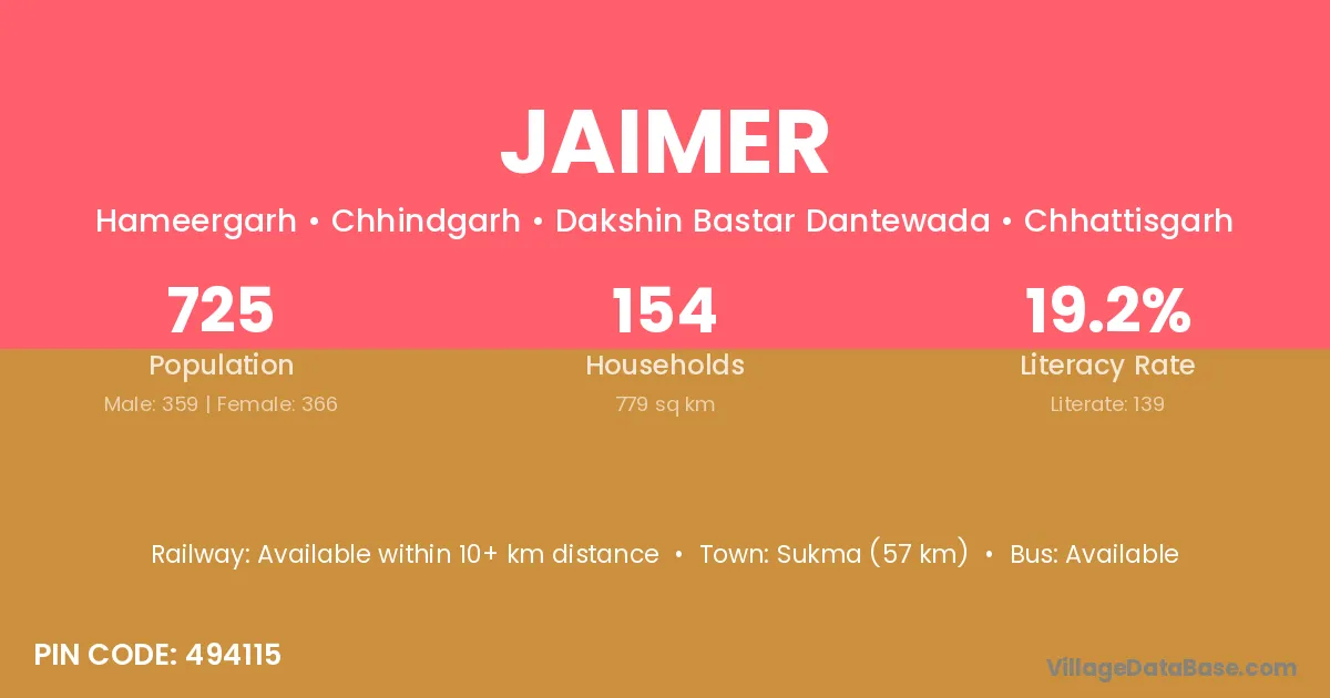 Sukma (57 km) is the nearest town to Jaimer village for major economic activities and is located approximately 57 km away.