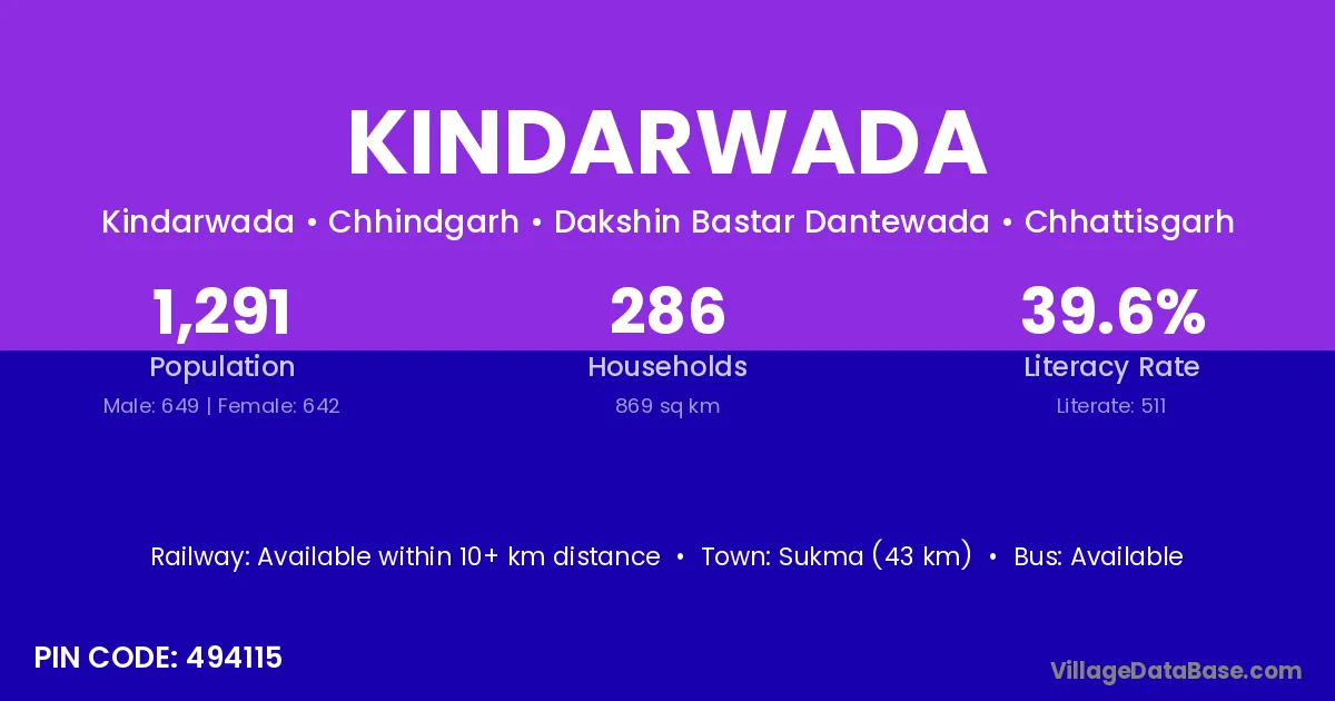 Sukma (43 km) is the nearest town to Kindarwada village for major economic activities and is located approximately 43 km away.