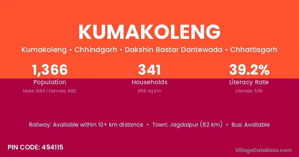 Jagdalpur (82 km) is the nearest town to Kumakoleng village for major economic activities and is located approximately 82 km away.