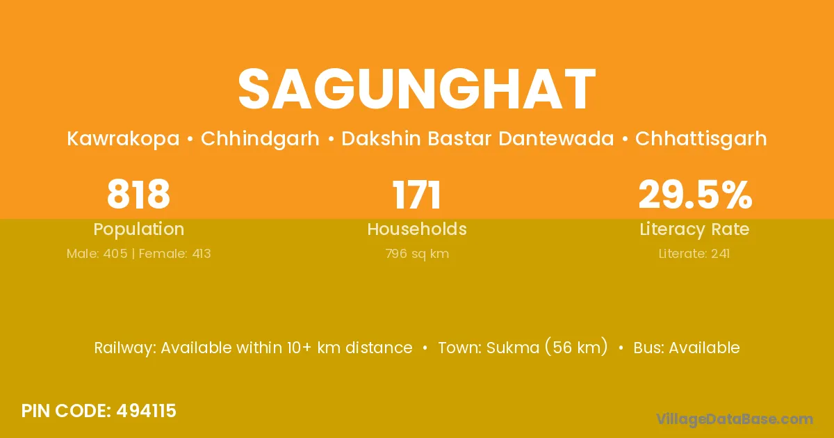 Sukma (56 km) is the nearest town to Sagunghat village for major economic activities and is located approximately 56 km away.