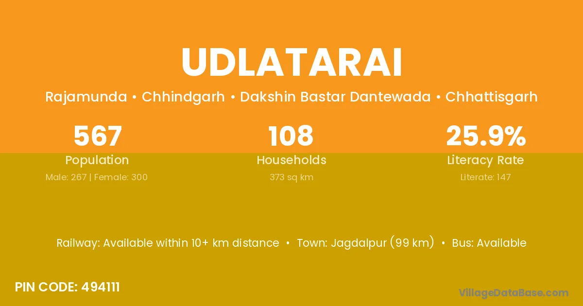 Jagdalpur (99 km) is the nearest town to Udlatarai village for major economic activities and is located approximately 99 km away.