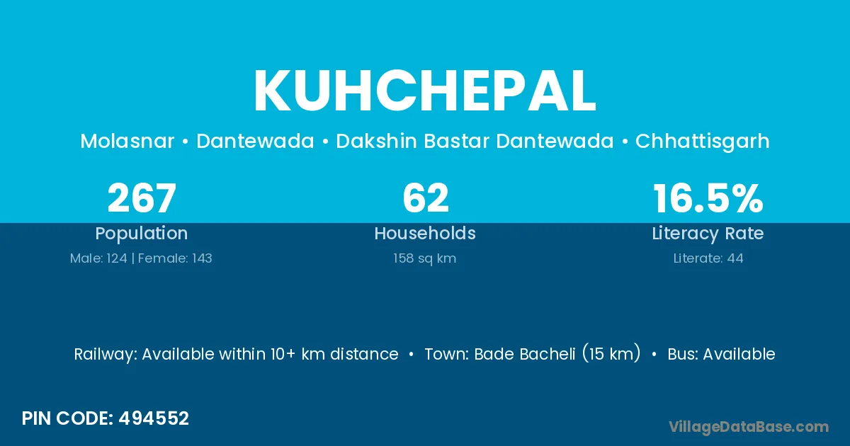 Bade Bacheli (15 km) is the nearest town to Kuhchepal village for major economic activities and is located approximately 15 km away.
